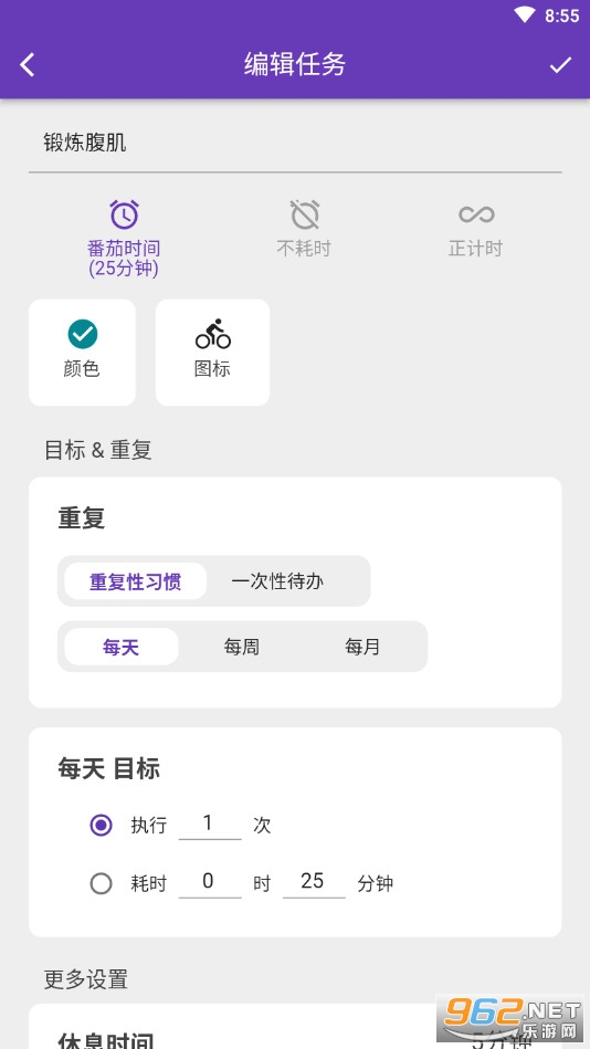 番茄指代时间记录功能。打卡任务可以设置不耗时、番茄时间(25分钟)、自定义倒计时、正计时几种时间形势。