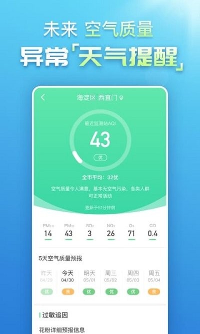 非常好用的天气预报软件,还可以针对各种气象灾害进行及时的气象预警,降雨趋势实时预报,生活指数助你轻松掌握穿衣出行情况,会及时的提醒用户查看,让用户能够快速的做好防范工作,不让异常天气影响到您的正常生活。