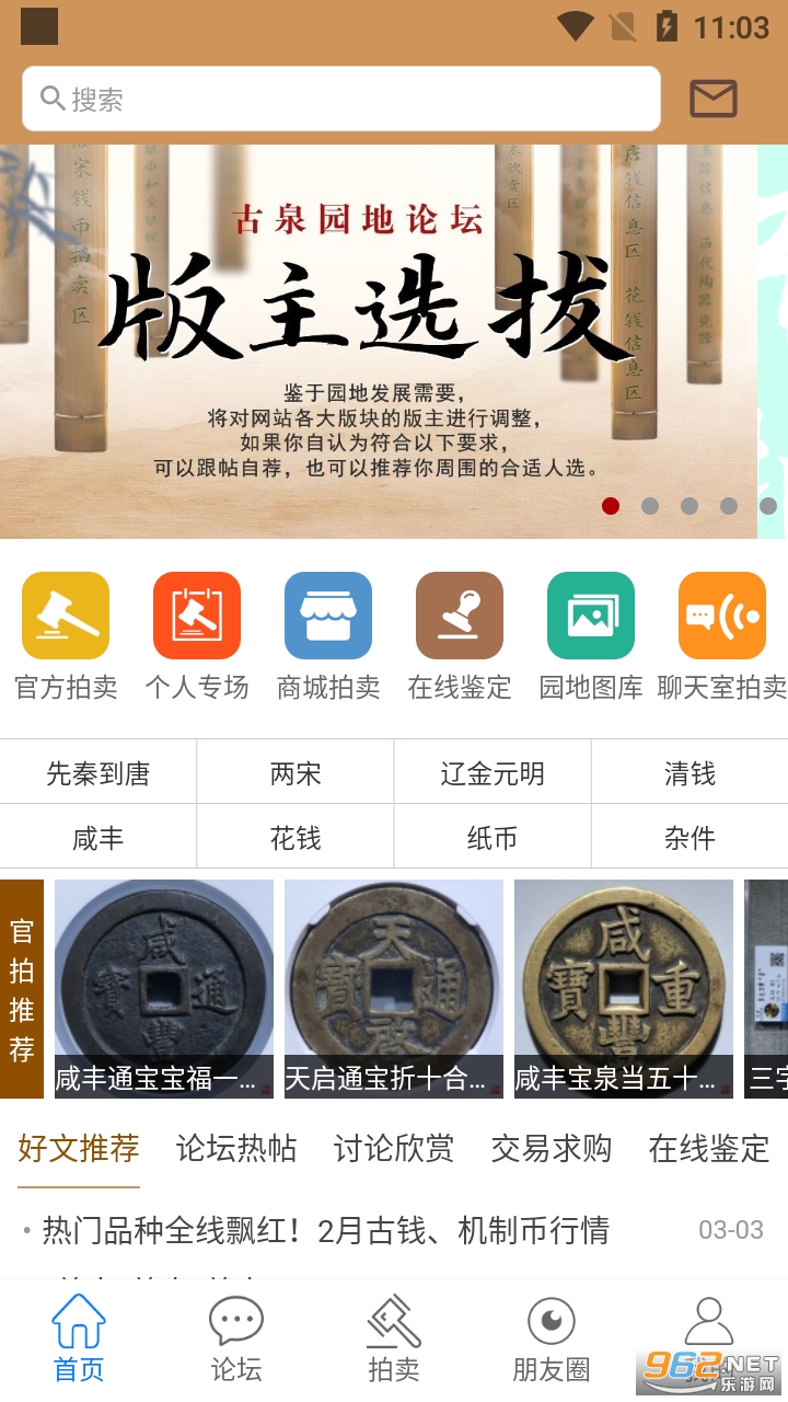 古钱界公认最著名的专业网站,你既可以参加官方拍卖活动,也可以参加个人的专场拍卖。大家可以在一起交流古玩币的心得,还可以进行论坛讨论,还能与你一起交流收藏经验,你也可以认识更多志同道合的新朋友,需要的可以下载古泉园地app使用!