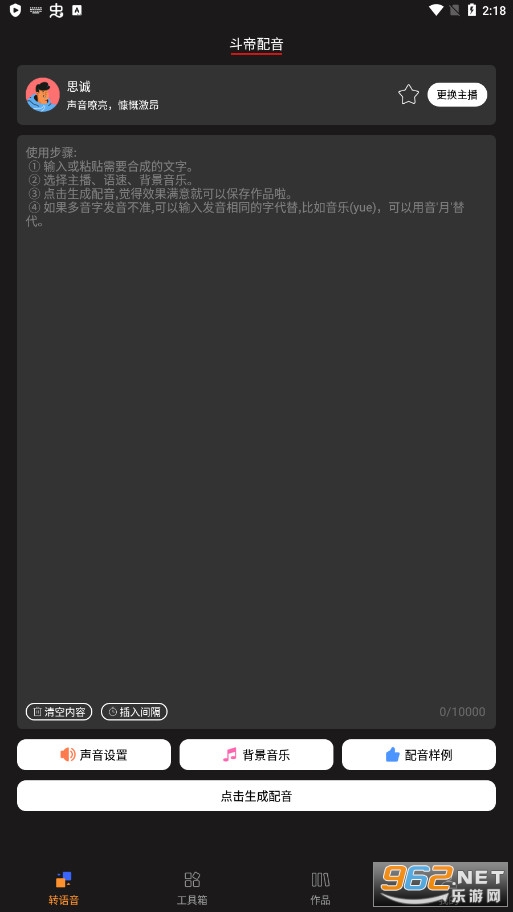 《斗帝配音》是一款好用的配音软件工具,你可以通过这款软件来制作出各种作品,通过输入文案来获取对应的语音音频,在这里有着超多不同类型主播可以选择。找到你需要的声音来帮助你说出各种话语。