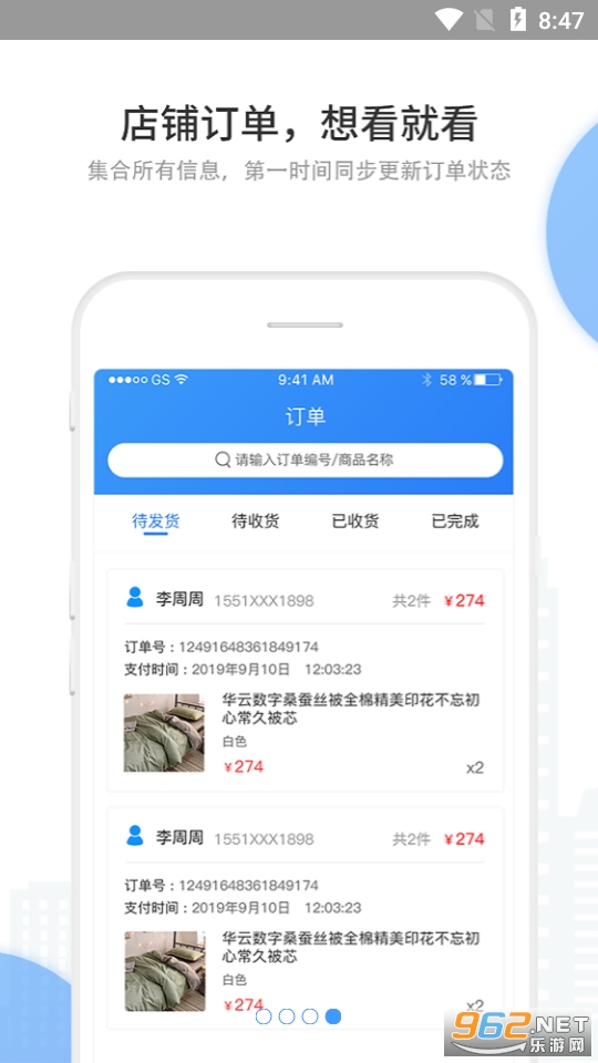 6、为用户提供订单版块,用户可以在这里看到各个订单信息,快速为客户发货;