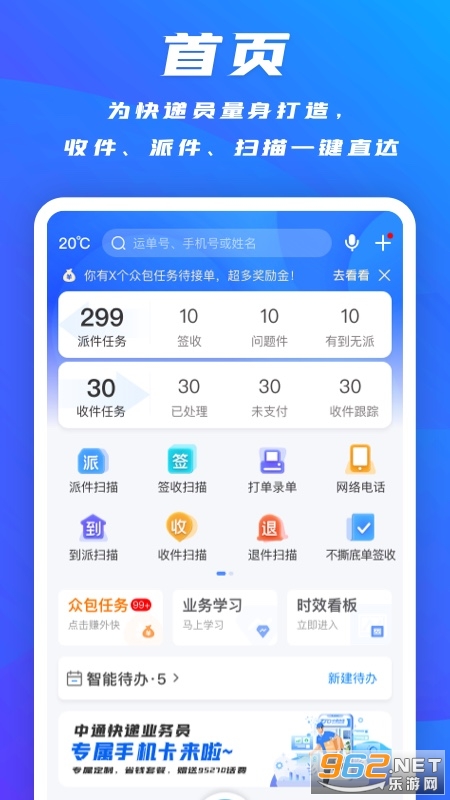 《掌中通app》是中通专门为快递员提升工作效率而打造的一款工作app,在掌中通app中支持收件、派件、扫描功能,让各位使用掌中通的快递员大大提升工作效率,还有一些平时用的小功能,欢迎大家前来下载体验!
