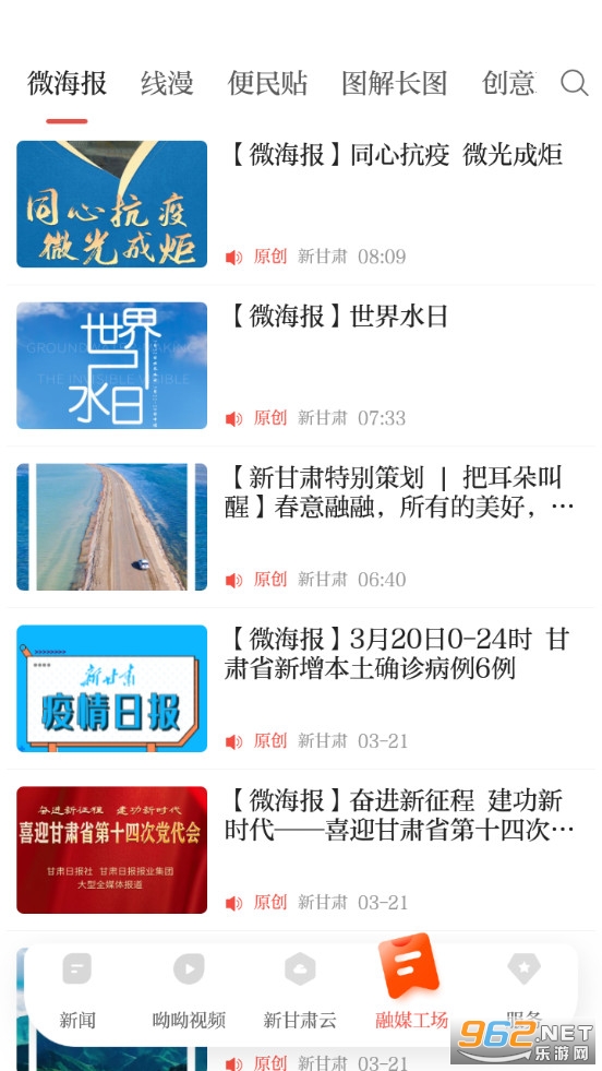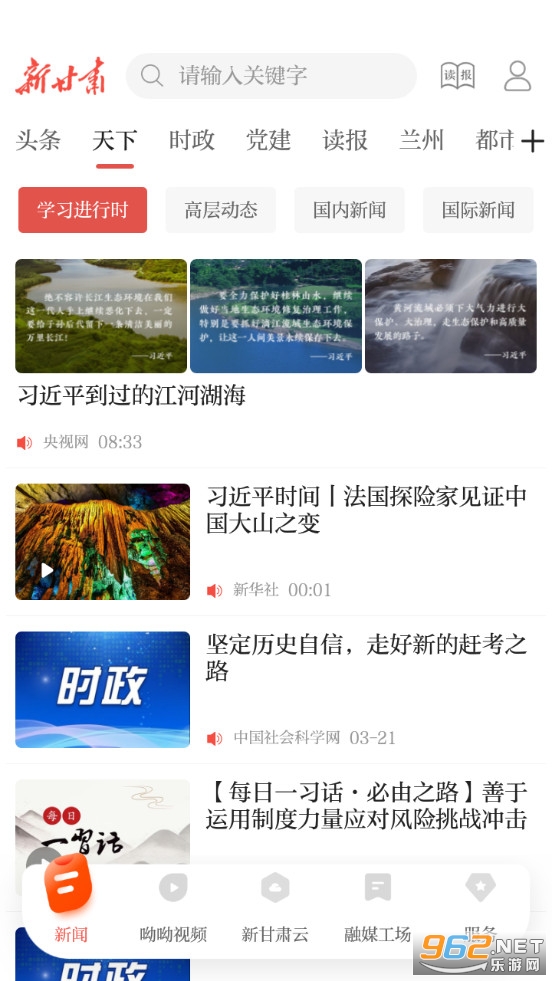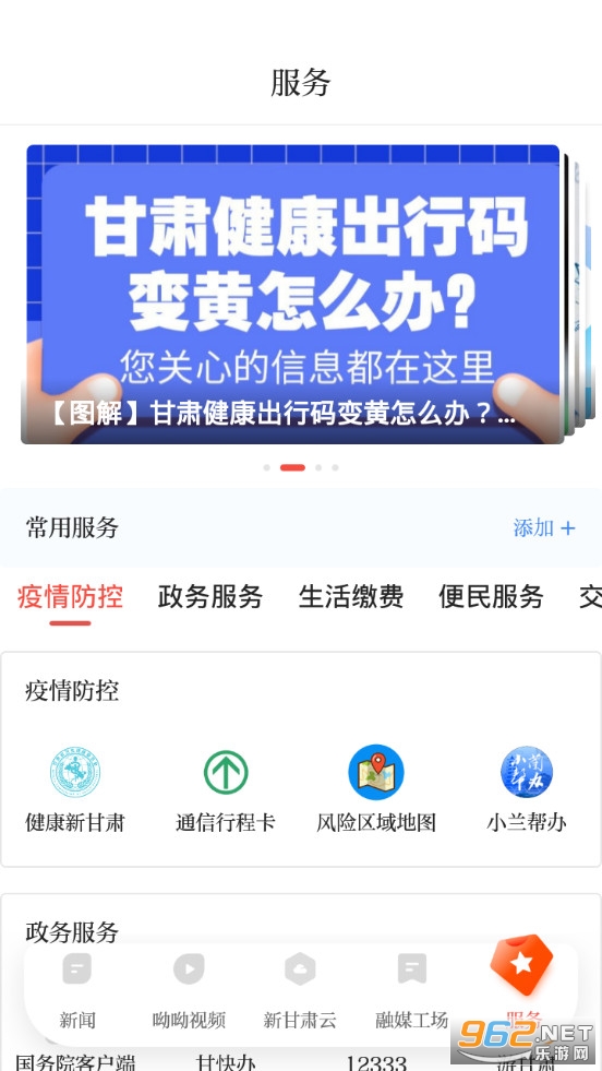 《健康新甘肃app》是甘肃云新媒体有限责任公司推出的一款新闻+政务+服务软件,健康新甘肃app有着新闻、视频、新甘肃云、融媒工场和服务多个栏目,可以在软件中阅读各种新闻资讯,观看新闻视频,也可以在服务栏目享用各种便利的服务。