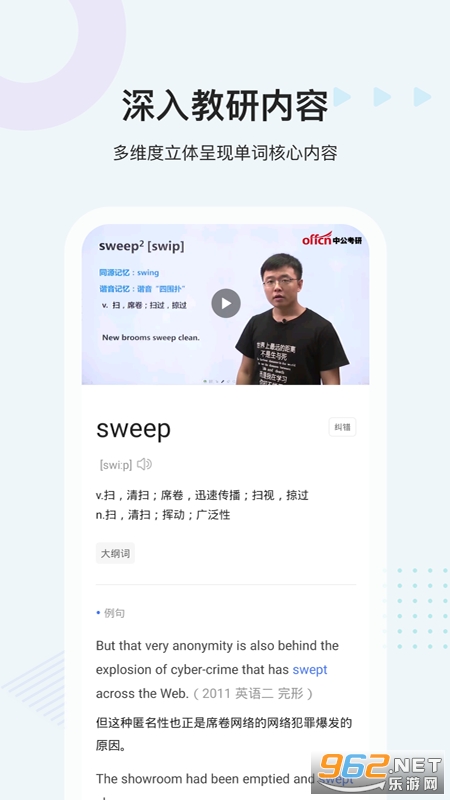 详细的单词讲解,包含读音、释义、真题例句、词根词缀、图片、视频讲解、记忆方法的多 维度介绍。
