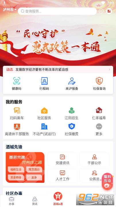 《泸州酒城e通》即泸州e通app,是泸州市一站式智慧生活服务平台,是泸州市一站式政务服务窗口,能够为泸州市民提供一揽子生活服务,让大家可以了解本地最新的新闻资讯爆料,还可以查健康码,行程码,查询社保,在线招生,报名等等,享受智慧泸州生活!