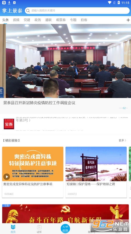 资讯:头条、推荐、视频、党建、政务、通联、观景泰、专题等