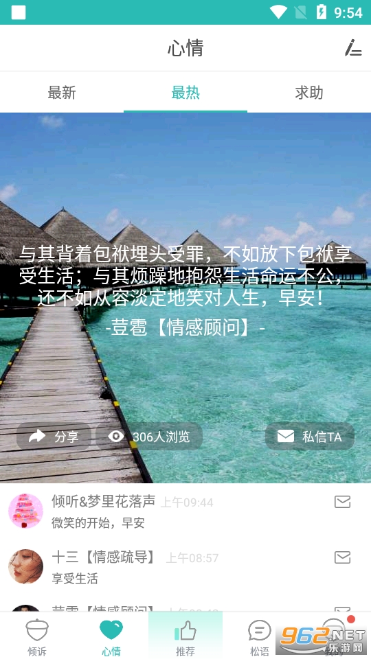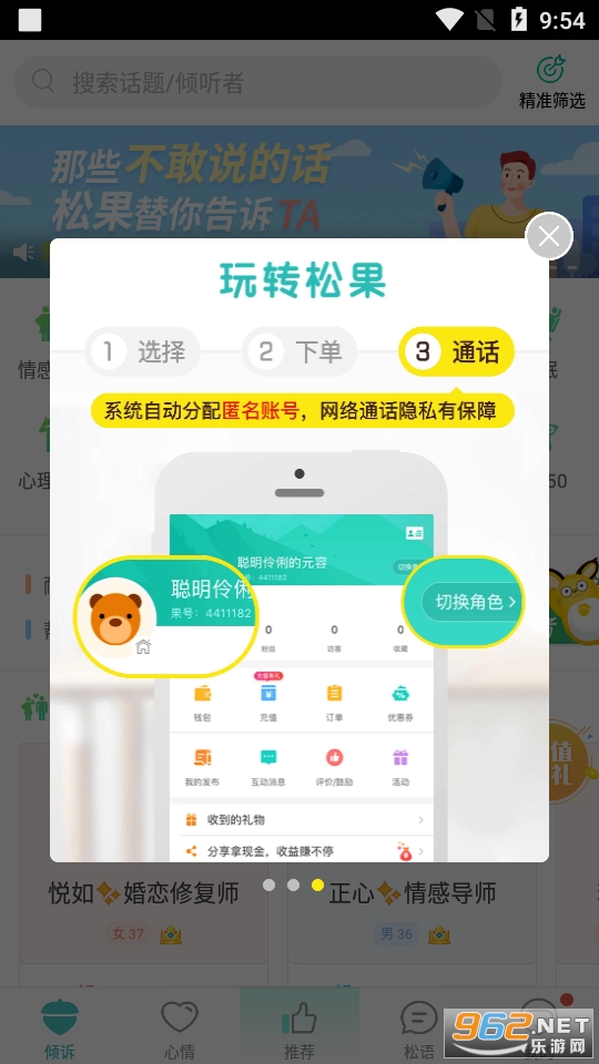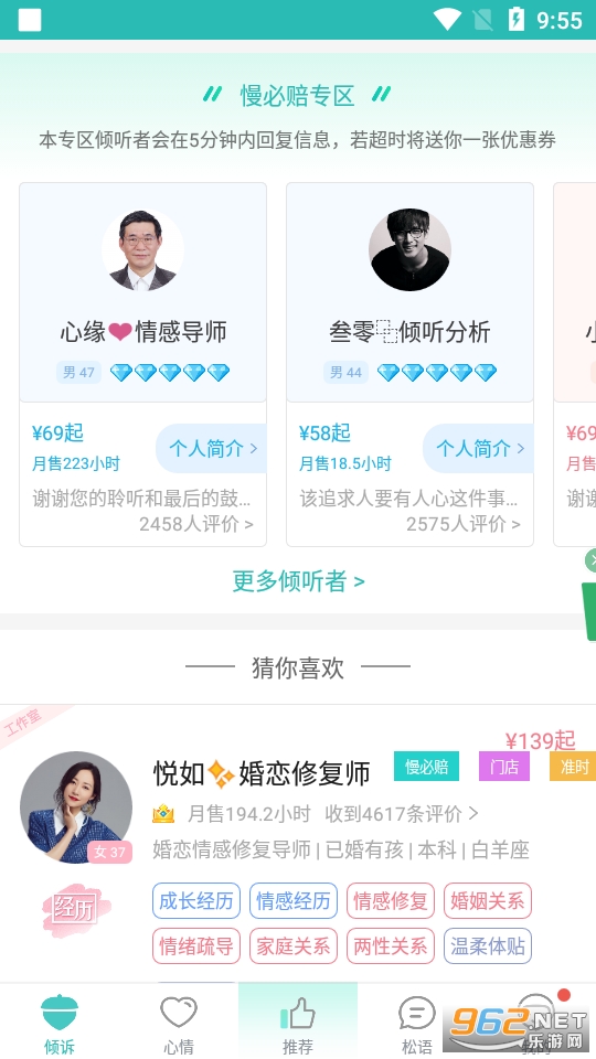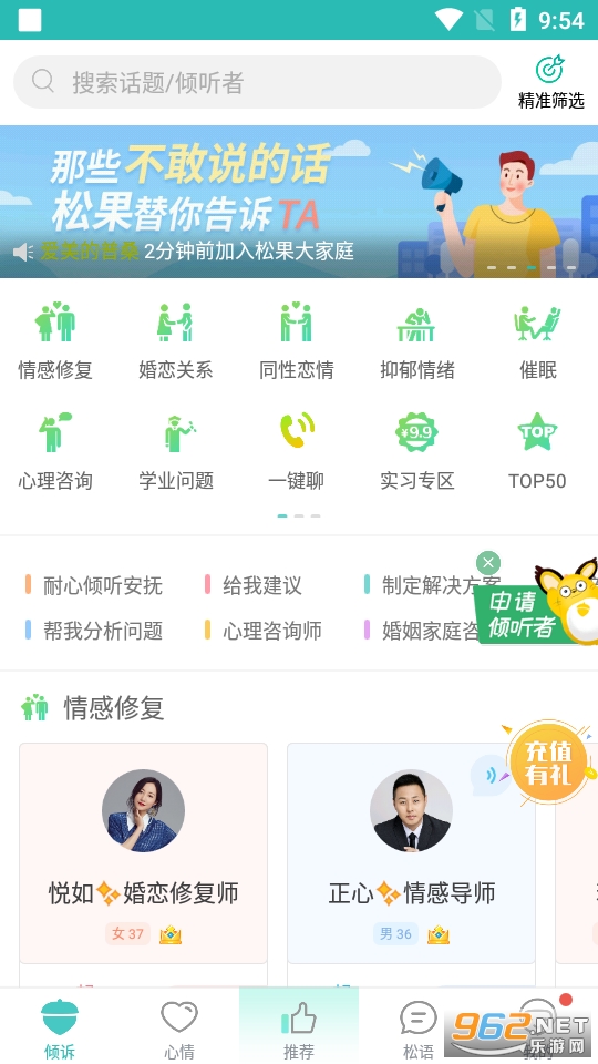 比较热门的一款情感心理咨询类的平台,可以一对一进行倾诉,平台内有超多经验丰富的咨询师,帮助你倾听你的心事,可以自己选择变声哦,快来试试吧!