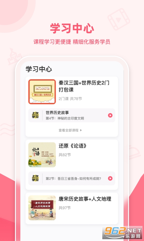 专属学习中心,与学习内容配套的场外指导(含音频、视频、图片、文字等)让学员更快更好的达到指导效果,让学习更便捷。