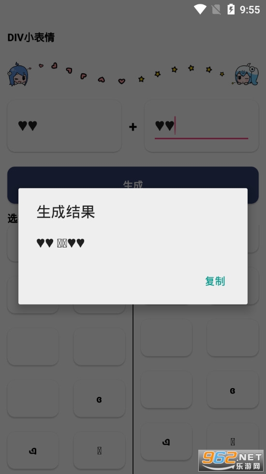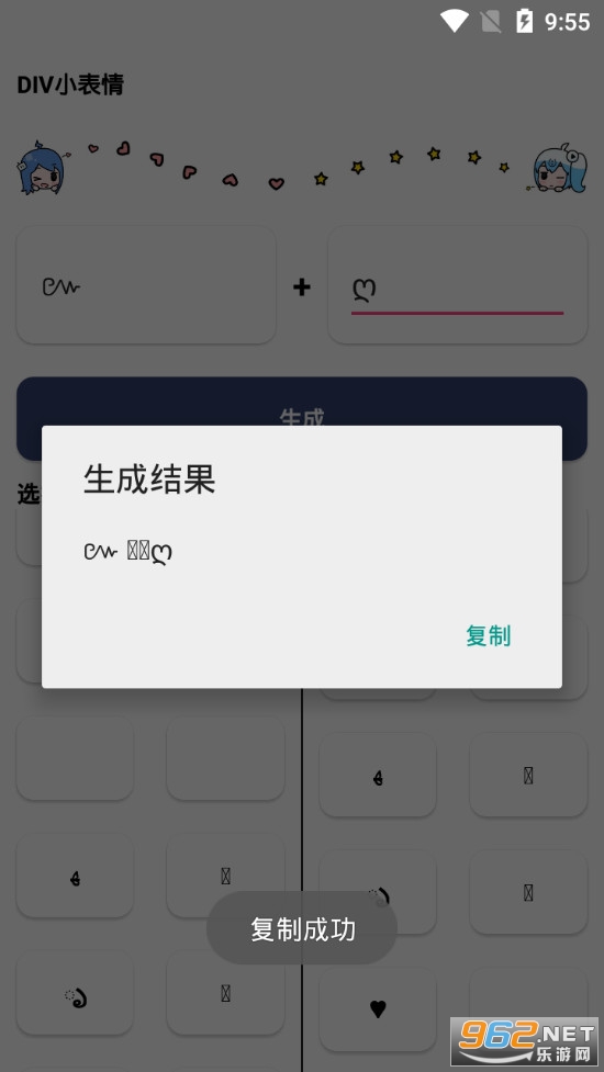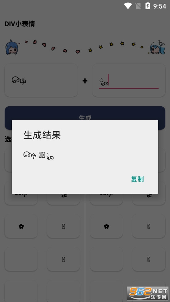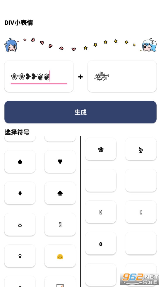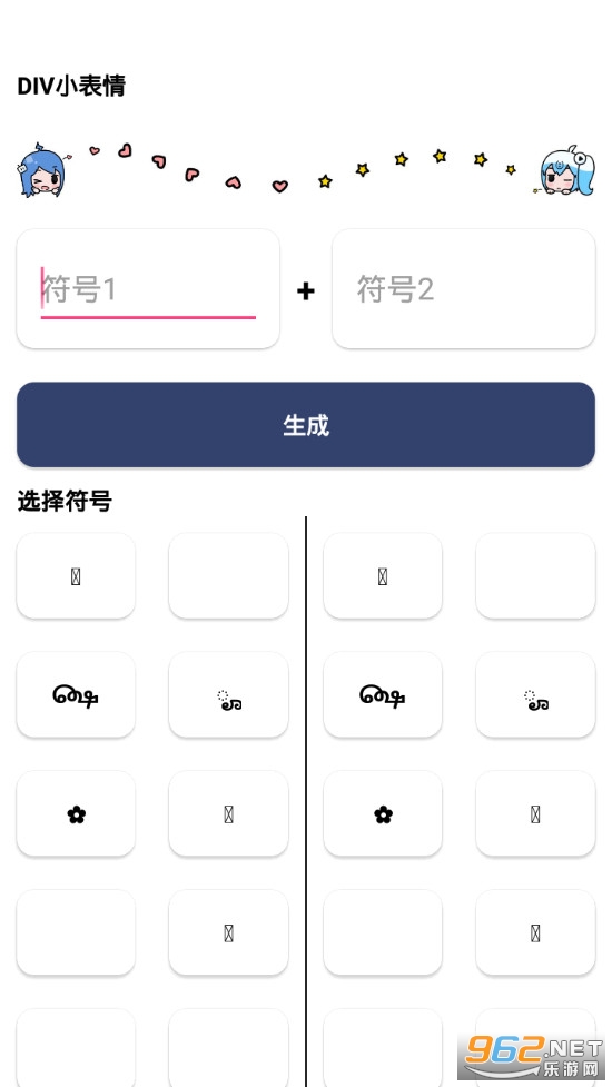《DIV小表情app》是一款为朋友们打造的表情自由搭配制作的软件,DIV小表情app中有着众多的特殊符号,朋友们可以点击这些符号来进行复制,然后粘贴到上面的制作输入栏就可,可以在两个输入框自由的粘贴,点击旁边的生成可以将两个输入框中的符号组合起来形成新的表情。
