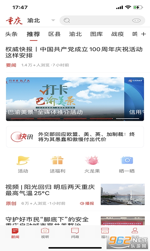 这是重庆本地的一款综合门户客户端,使用这款软件不仅能快速掌握身边大小事,还能通晓国内外时事新闻资讯,并且还有许多办事服务通道,直接线上办理,综合性很强的门户软件,推荐生活在重庆的用户下载使用。