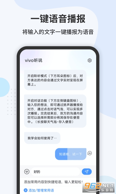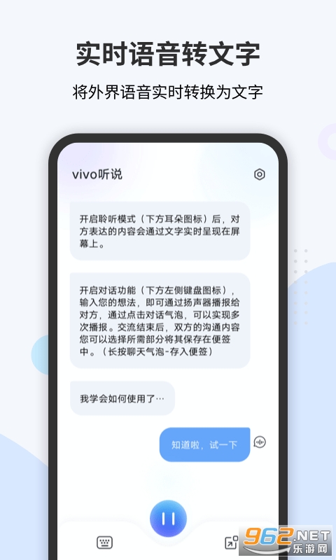《vivo听说》是一款即时语音转文字、文字广播软件,能够为用户提供语音播报,语音转文字,文字转语音等功能,让大家可以自由的选择不同的语音模板,进行语音播报,文字转语音等等,解决大家在不方便说话或者倾听时的问题,还可以在开会的时候快速记录文字,超级方便!