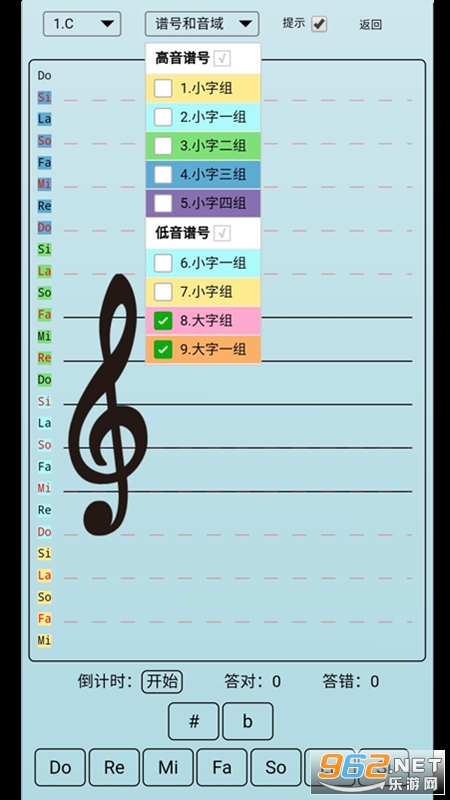 可以选择所有不同的调进行练习(1至7个升号或降号b)。