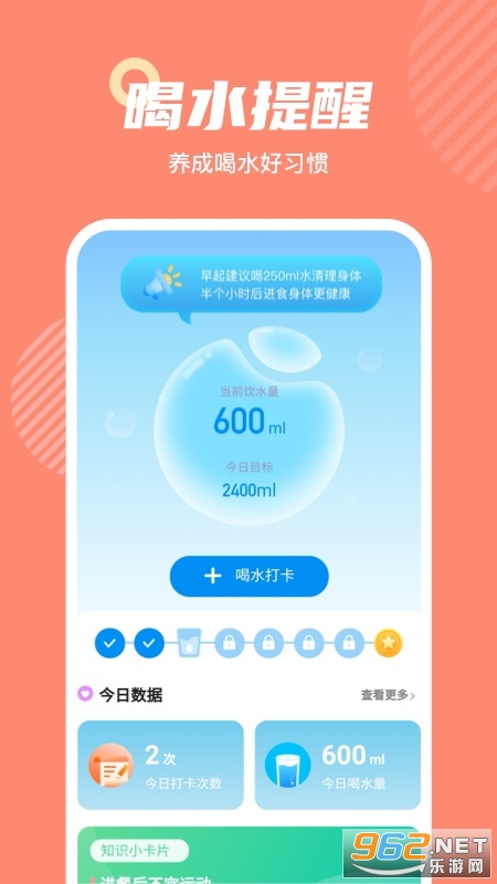 悦动宝是一款运动健康软件,您可以进行喝水记录、运动打卡等。多喝水可以利用身体机能能够正常的运转,减少皱纹,令皮肤保湿,有光泽,还能够使体液分泌正常,不会出现口干,眼干等现象。