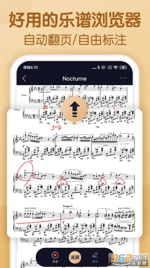 【自动滚动翻页】在演奏过程中手动翻谱往往会手忙脚乱且容易出错,自动滚动翻页恰好能帮你解放双手,专心演奏,快调节到合适的速度试试吧!