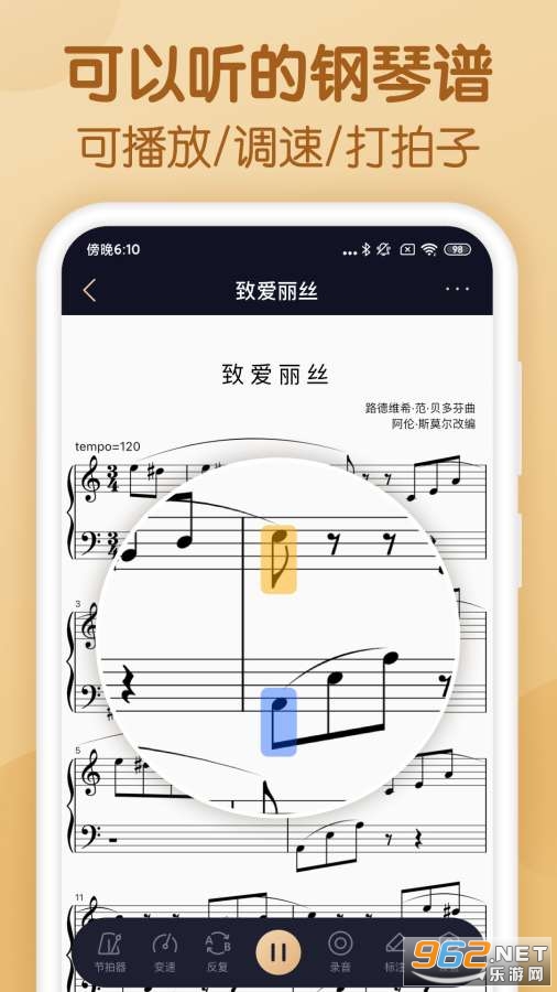 【强大的智能乐谱】乐谱可播放,并配合变速/节拍器,谱表宽度调节等小工具,让你的练习,演奏更加流畅,舒适。