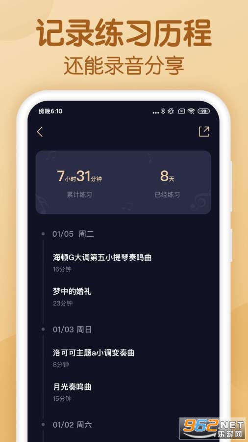 【练习记录】练习是枯燥的,个人练习更是如此。懂音律能自动记录你的练习情况,同时你可以录音分享自己的成果,复听帮自己纠错。