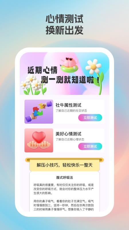 3、心理互动轻量化,提供简单有趣的心情测试题目,帮助用户在娱乐中关注自身情绪状态,增添自我了解乐趣。
