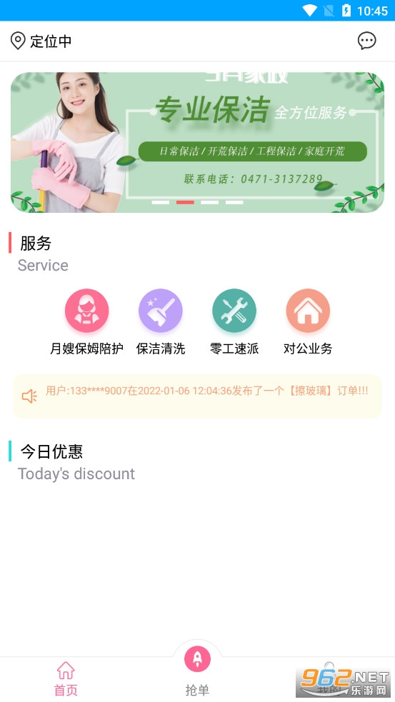一款好用的保姆家政服务软件,软件中你可以在这类请保姆、保洁等多种家政服务,定位自己的位置,了解各个家政人员的情况,同时这款软件也为家政服务人员提供了抢单服务,推荐给有需要的用户。