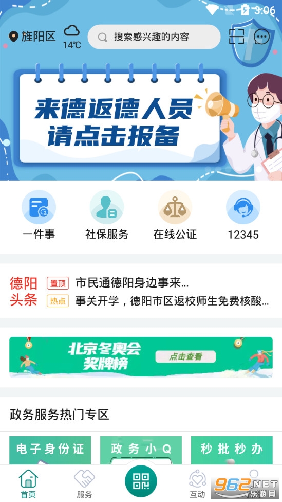 《德阳市民通app》是一款为德阳的朋友们打造的政务与生活服务平台,德阳市民通app中有着首页、服务、互动、我的多个栏目,可以在服务栏目享用各种服务,比如查看行程卡、预约申请办事、缴纳水费、婚姻登记、公交查询、航班预定等等,便利生活。