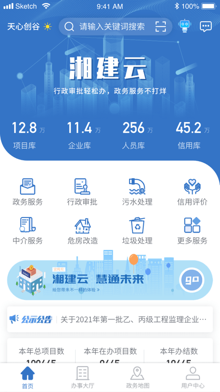 湘建云以“政策+政务+服务”功能为依托,全面整合企业、项目、人员、信用等资源,涵盖建筑政务办理、政策公开等内容。