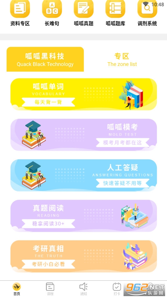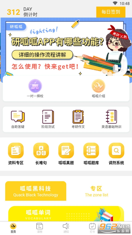 《研呱呱》是由重庆研达教育信息咨询服务有限公司开发的针对考研学生准备的学习软件,在这里你可以在线学习各种考研课程,还有着在线疑问回答,关于考研的各种问题,每天打卡学习养成好的习惯,现在就来试试吧!
