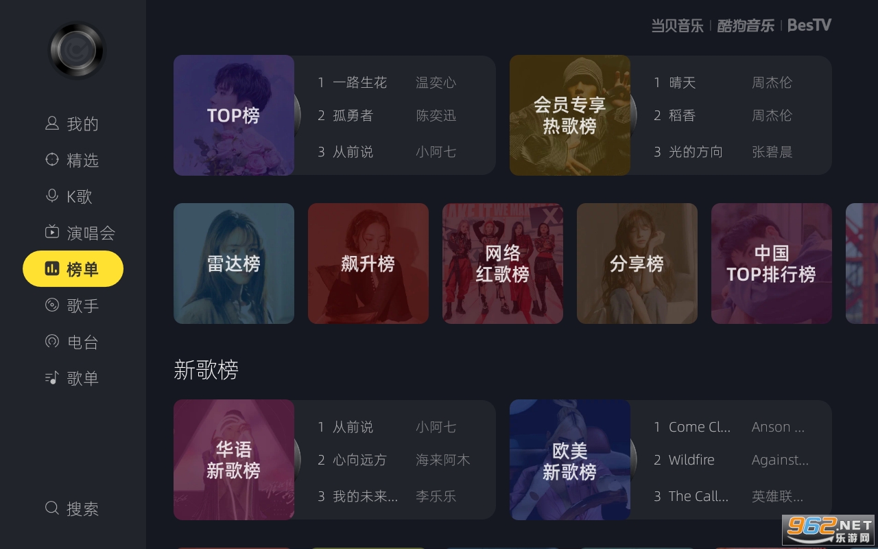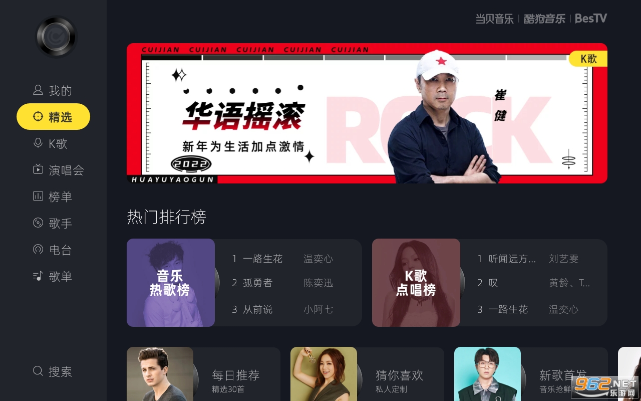 以家庭用户为核心,由当贝和酷狗音乐针对智能电视、电视盒子等智能Android平台打造的正版在线音乐应用。拥有千万级正版曲库,满足不同年龄段不用喜好的用户对音乐的需求;无损音质,带来无与伦比的音乐享受;精选推荐内容,听你所爱;优秀的体验,便捷的歌曲管理;权威榜单,精选电台,等你来体验!
