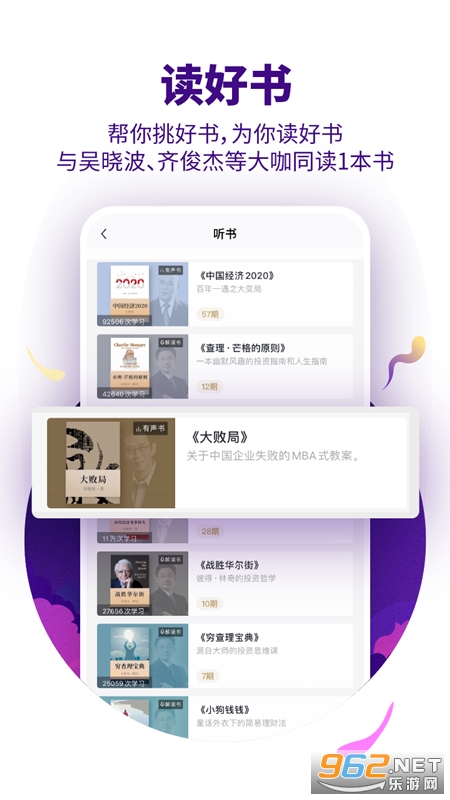 《大败局》《穷爸爸富爸爸》《投资最重要的事》《血疫》……涵盖投资、商业、人文等经典好书,吴晓波等大咖亲自解读,上班路上听、开车听、睡前听,把有声商业图书馆随时带在身边。