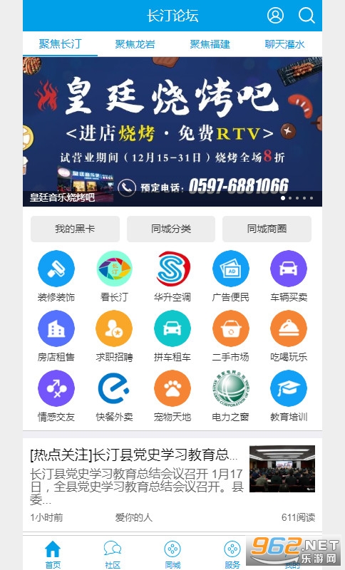 《长汀论坛》是由长汀县新天地文化传媒有限公司开发的本地论坛收集客户端软件,在手机上更好的使用论坛的功能。更加便捷的上传图片,更好的和好友进行互动交流,随时随地获取最新的消息,现在就来试试吧!