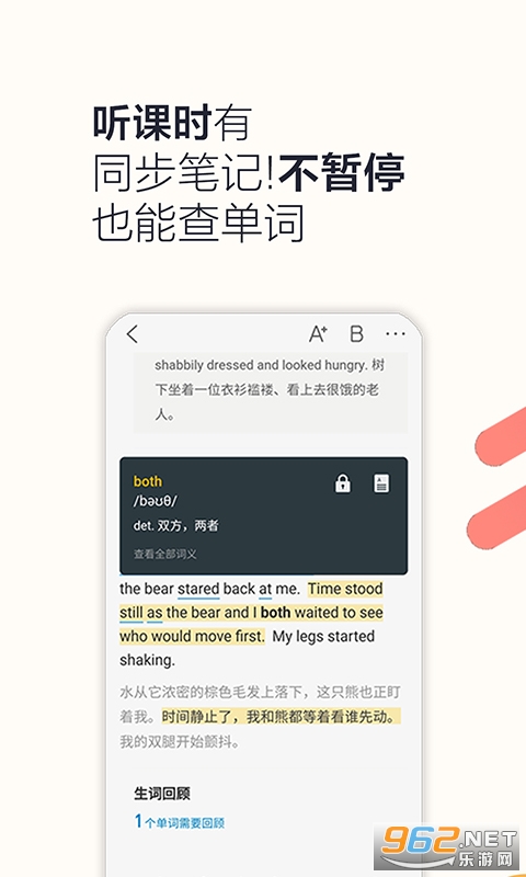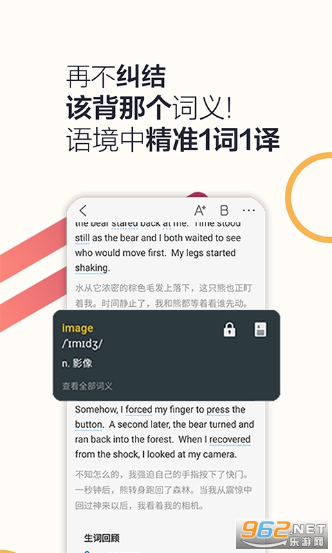 句子为学习的最小单位.点击生词,根据翻译提示尝试翻译句子。在语境中记词更符合语言学习规律。