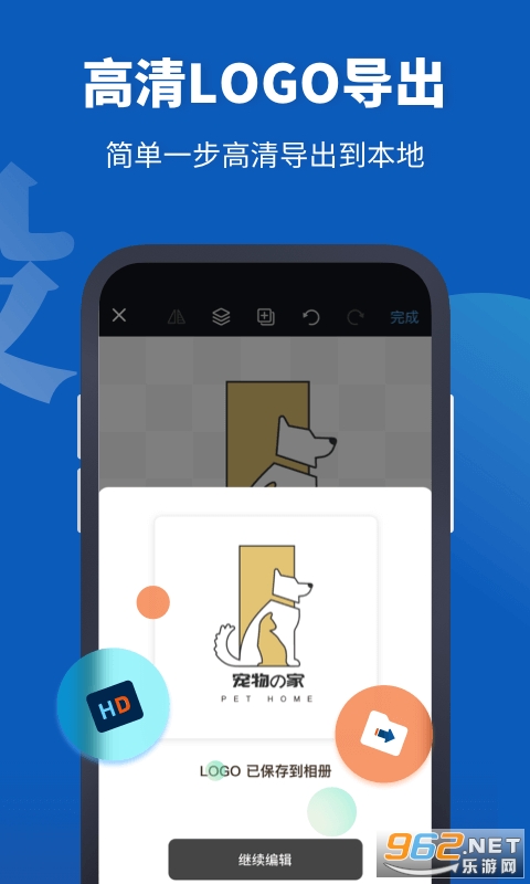 Logo设计助手提供矢量图形设计功能,在用户设计出满意的logo之后,即可导出高清大图到本地,简单的一步操作即可获得4K像素打印级别的logo图形。