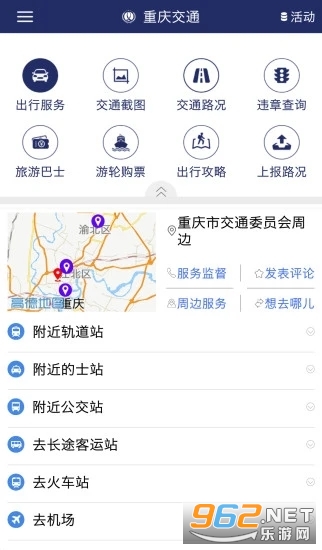 重庆交通服务APP集路况、公交、轨道、长途、出租车、铁路、航班、轮船、旅游自驾等服务功能于一体。包括了出行服务”、“交通路况”、“上报路况”、“出行攻略”、“交通截图”、“游轮购票”、“旅游巴士”等十三大功能板块。