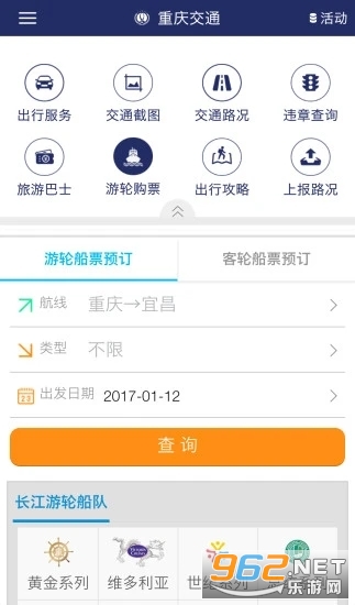 “游轮票务”板块,是重庆交通服务与长江游轮票务联网销售中心合作开办的一档服务栏目,使用者不但可以查询到长江游轮、客轮、两江游船的相关信息,还能够直接在该板块中通过长江游轮票务联网销售中心提供的购票页面进行船票预订和购买。