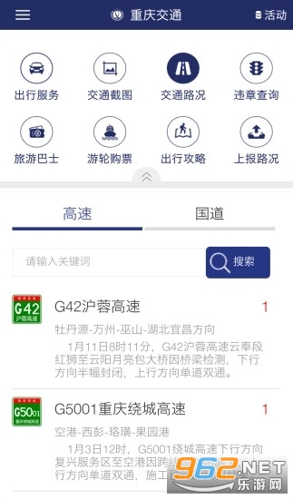 “交通路况”板块,涵盖了重庆区域内高速公路及国省道的及时文字路况。