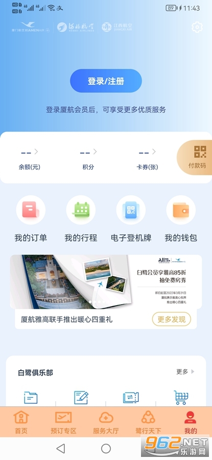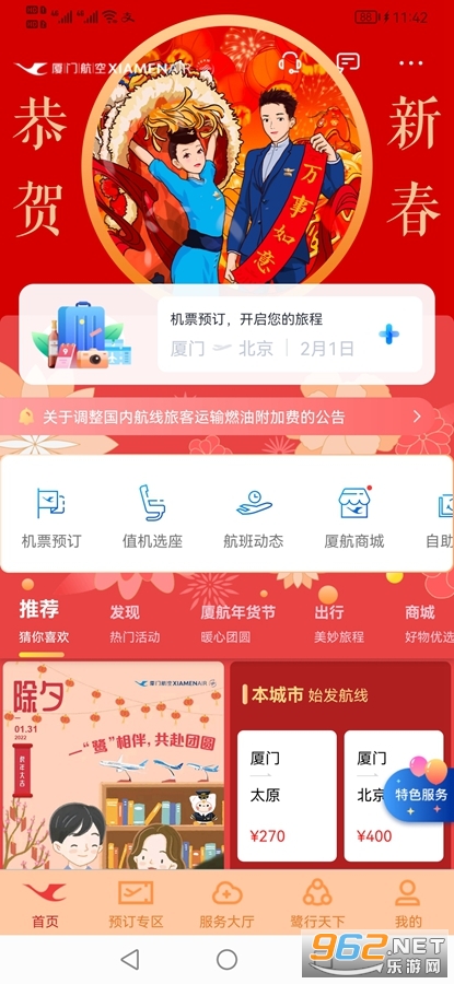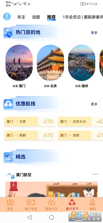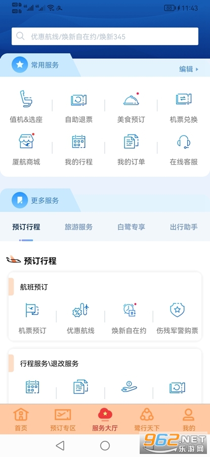 《厦门航空app》是厦门航空有限公司推出的一款购票服务平台,厦门航空app有着首页、预定专区、服务大厅、鹭行天下和我的多个栏目,可以在预定专区去预定自己需要的机票,可以选择座位和值机,如果有事还可以进行退票和更改日期,可以查看自己的行程等。