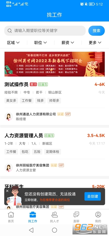 徐州英才网新版APP,每天更新大量徐州地区招聘信息,且信息真实有效,无中介,无保险公司,给求职者创造一个优越的求职环境。