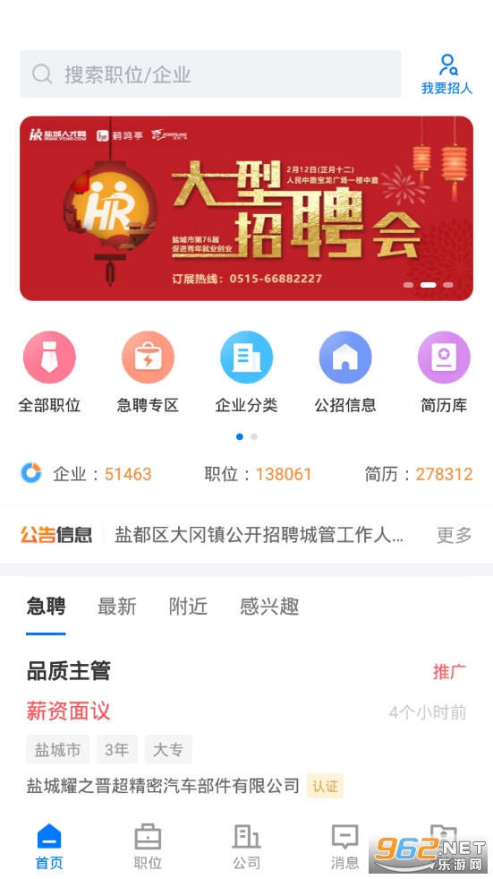 找工作、快速招聘就上盐城人才网!专业招聘平台:移动求职、在线沟通、技能培训、大数据精准推送,全方位的人力资源服务!众多名企招聘信息,搜索您想要的职位,免费注册会员,填写简历,找工作就是这样轻松!