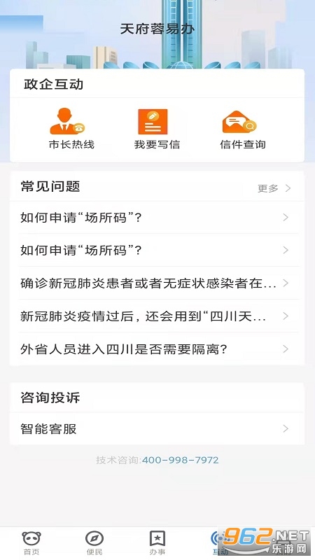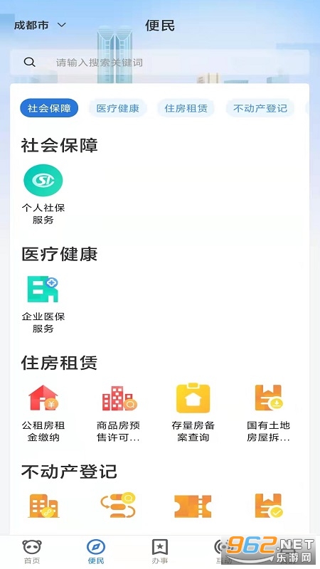 《天府蓉易办app》是成都市数字城市运营管理有限公司推出的一款成都市综合服务平台,成都的朋友们可以在天府蓉易办app中体验各种政务和生活服务,软件有着首页、便民、办事、互动和我的五个栏目,有着大量的服务可以体验。