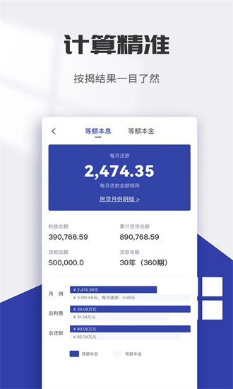 2、专业房贷计算:支持用户输入房价、首付、贷款年限、利率等信息,精准计算每月还款额、利息总额及还款计划详情。