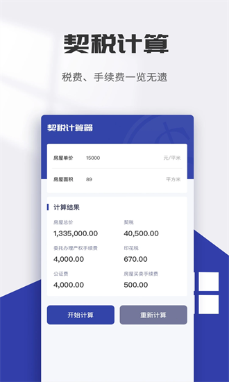 3、智能契税计算:依据房屋交易价格与用户所选地区政策,自动计算应缴纳的契税金额,并提供明细说明。