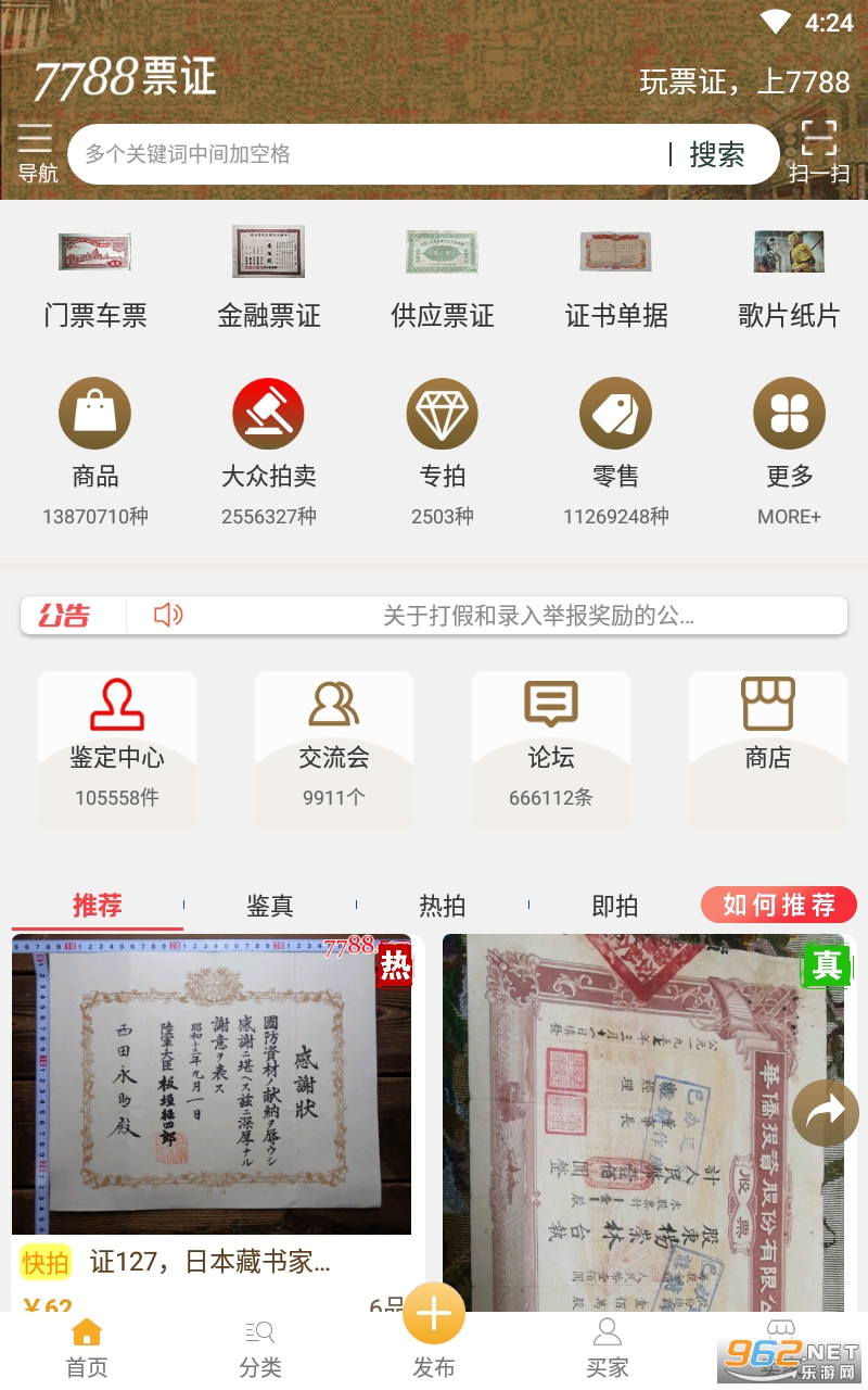 7788票证是专业的票证收藏、鉴定、投资、拍卖交易平台,主要提供专业的票证分类目录、权威专家鉴定、交流会和拍卖会信息、论坛交流以及多种交易模式等版块功能。