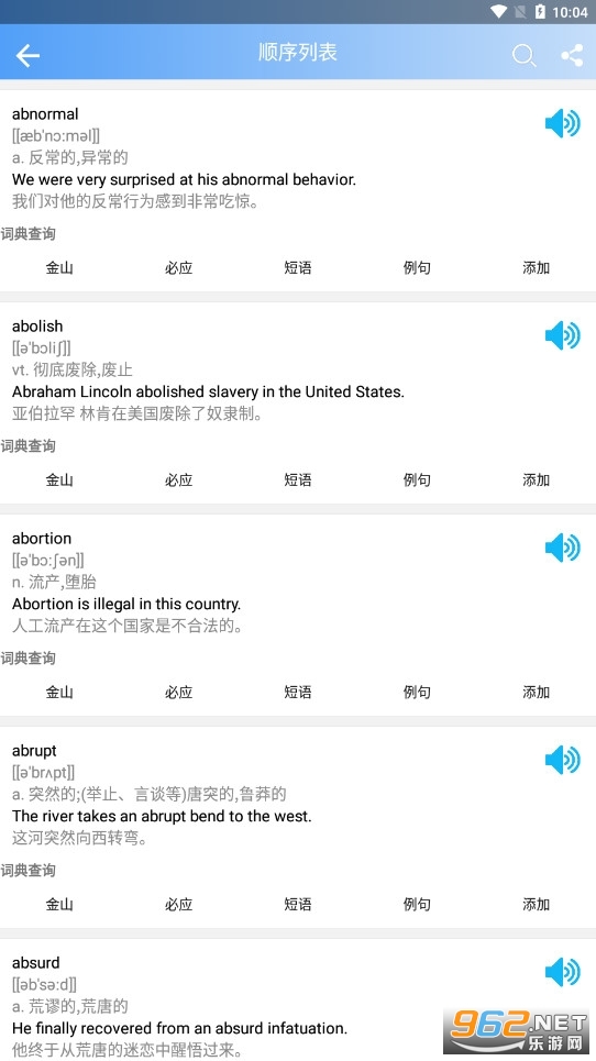 按顺序背诵、随机背诵、按字母背诵,加入生词本以便重点记忆;单词采用短语+例句的场景化记忆方式,让您对单词