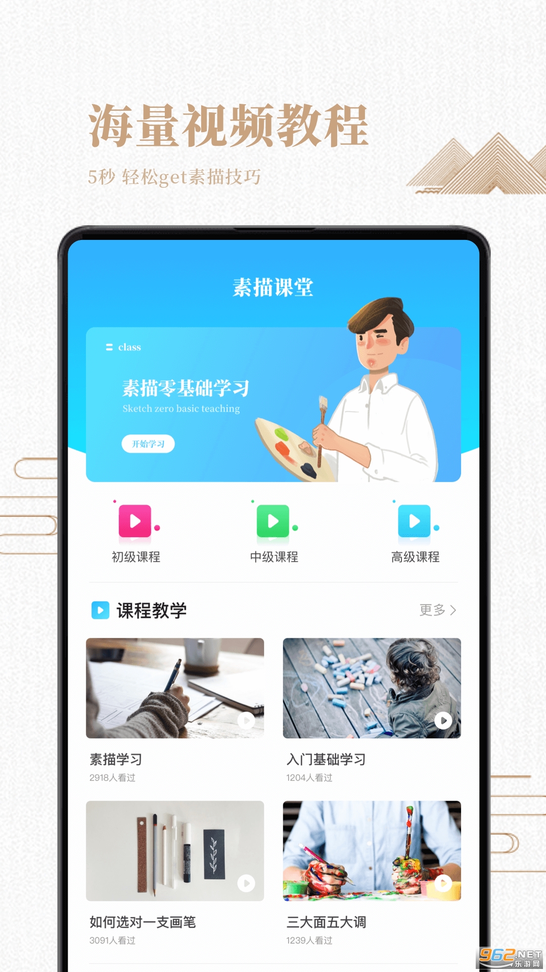 从零基础开始,入门学习素描、画画、绘画。还提供大量作品赏析,书法等学习课程!