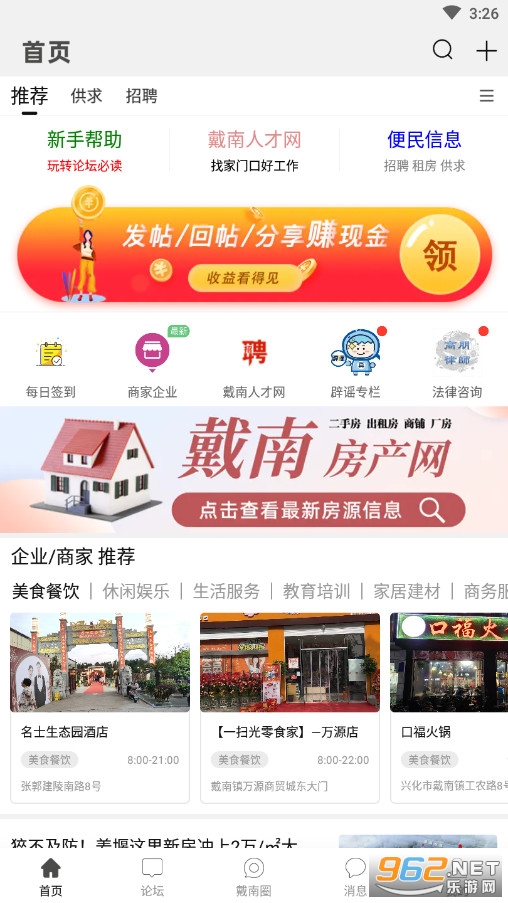 戴南论坛手机客户端隆重发布!是戴南居民吃、喝、玩、乐、购、住、行一站式分享和交流的平台,在这里可以免费注册、发帖回帖、参与活动、互动投票、留言交友等,还能随时随地尽览本地最新最全的商家打折优惠信息。
