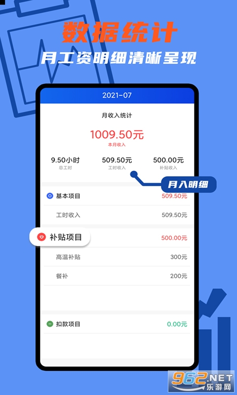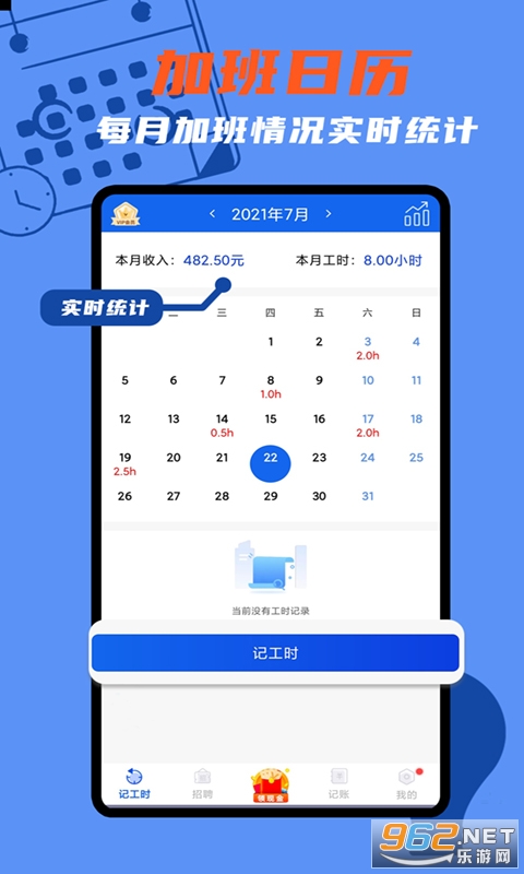 【工作日历】:一张日历清楚展现每月的工作时长与得到的薪资,可以具体显示每一天的工作时间与收益状况。