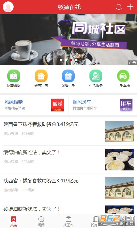 《绥德在线》是由陕西新米文化传媒有限公司开发的绥德生活服务类网站手机客户端,在这里你可以获取各种各样的本地信息,便捷你的生活。同时也是一个在线的聊天交友社区,快来下载试试吧!