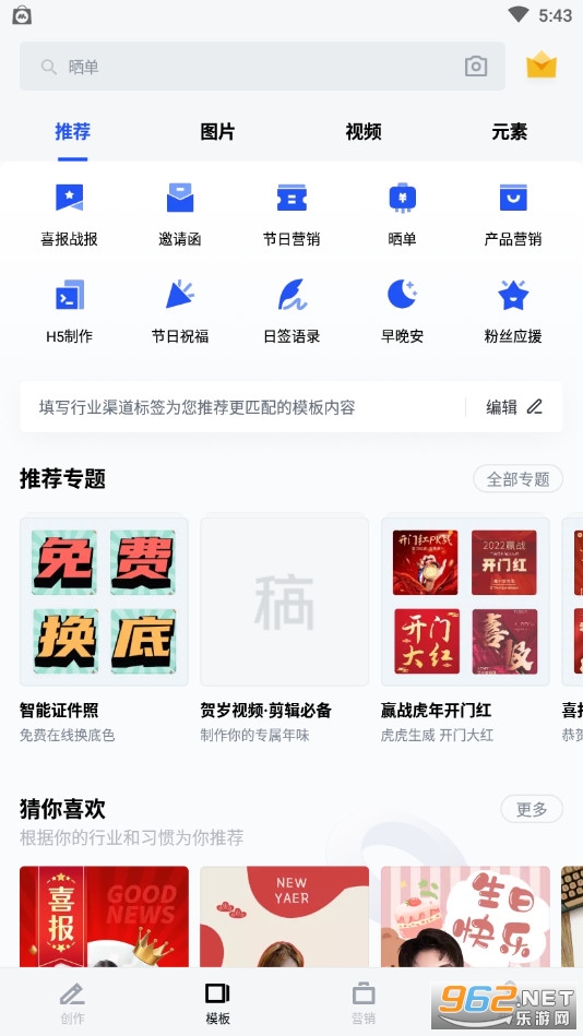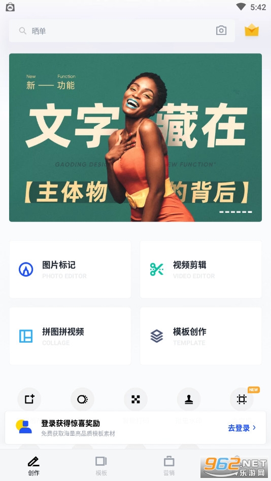 使用简单便捷,有了这款软件让你随时都能轻松制作,三秒钟抠图,抖音快手等热门短视频轻松搞定,还有海量正版授权资源,使用无忧。除了可以制作图片编辑图片之外,还有专业的视频剪辑功能,有超多优质模板等着大家来下载使用。