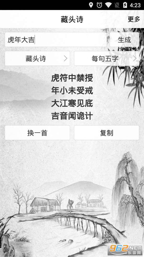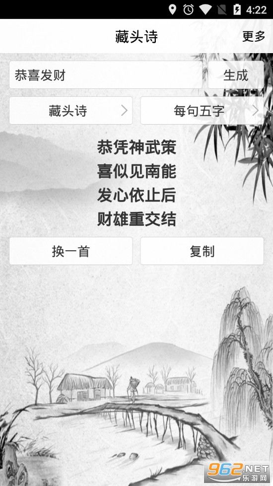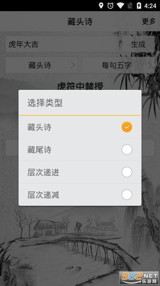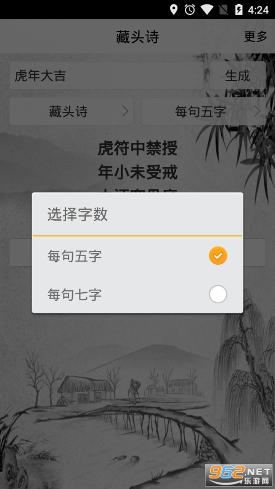 《好藏头诗app》是一款为朋友们打造的生成诗句的软件,软件有着藏头诗、藏尾诗、层次递增、层次递减四种不同的类型,可以选择五言诗和七言诗,设置好基本条件后输入自己想要表达的语句即可生成相应的诗句了,如果不满意可以点击换一首来进行更换。