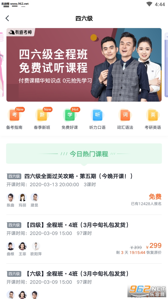 《有道学堂在线授课》是一款非常专业的掌上学习教育平台,帮助备考四六级的用户提供最好的线上教育模式,专业名师在线直播,海量的教学课件全部免费提供,有兴趣或者需要的快来962下载吧!
