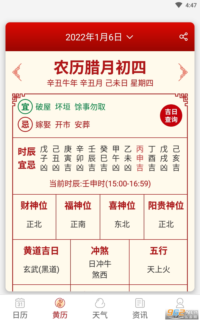 2、黄历:全面的农历老黄历信息,详细罗列黄历宜忌、黄道吉日等,同时还附有黄历现代文解读,帮助您轻松掌握;