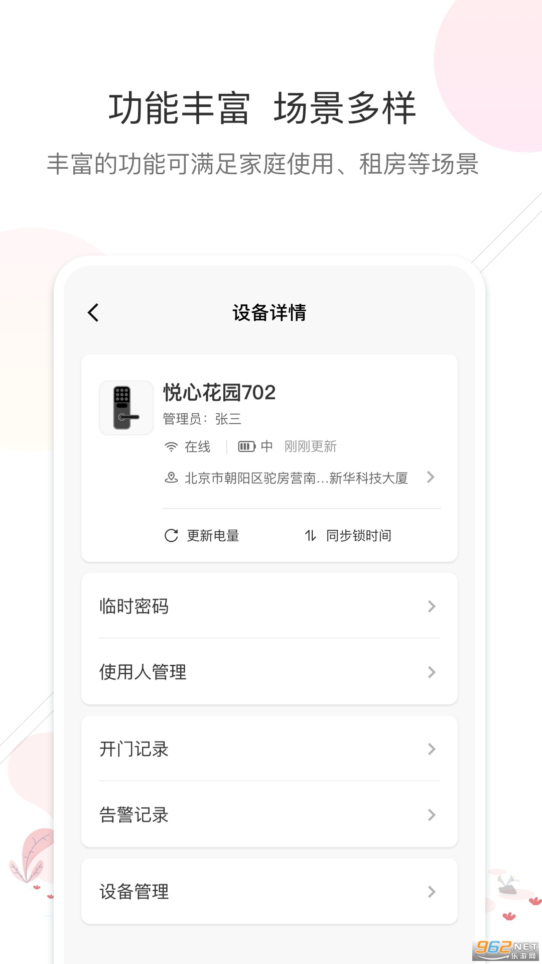 App内包含一键开门、远程申请开门、使用人管理、查看开门记录、设置临时密码等功能,满足生活中多种场景需求。